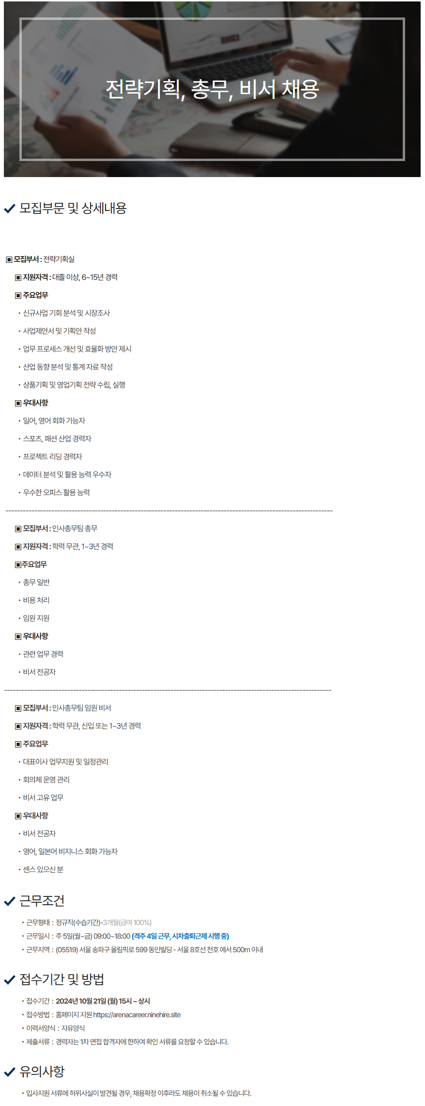 [아레나코리아㈜] 전략기획, 총무, 비서 채용