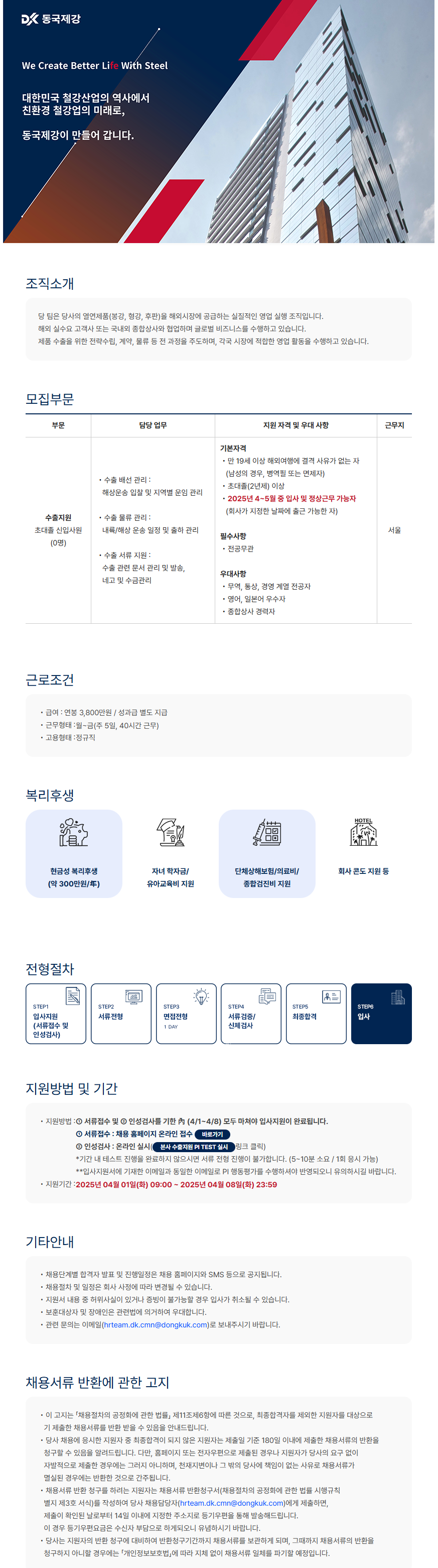 [동국제강㈜] 본사 수출지원 부문 초대졸 신입사원 채용