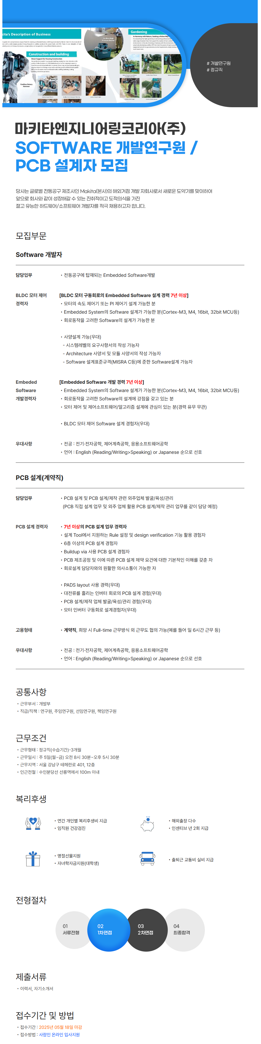 [마키타엔지니어링코리아㈜]Software 개발연구원 / PCB 설계자 모집