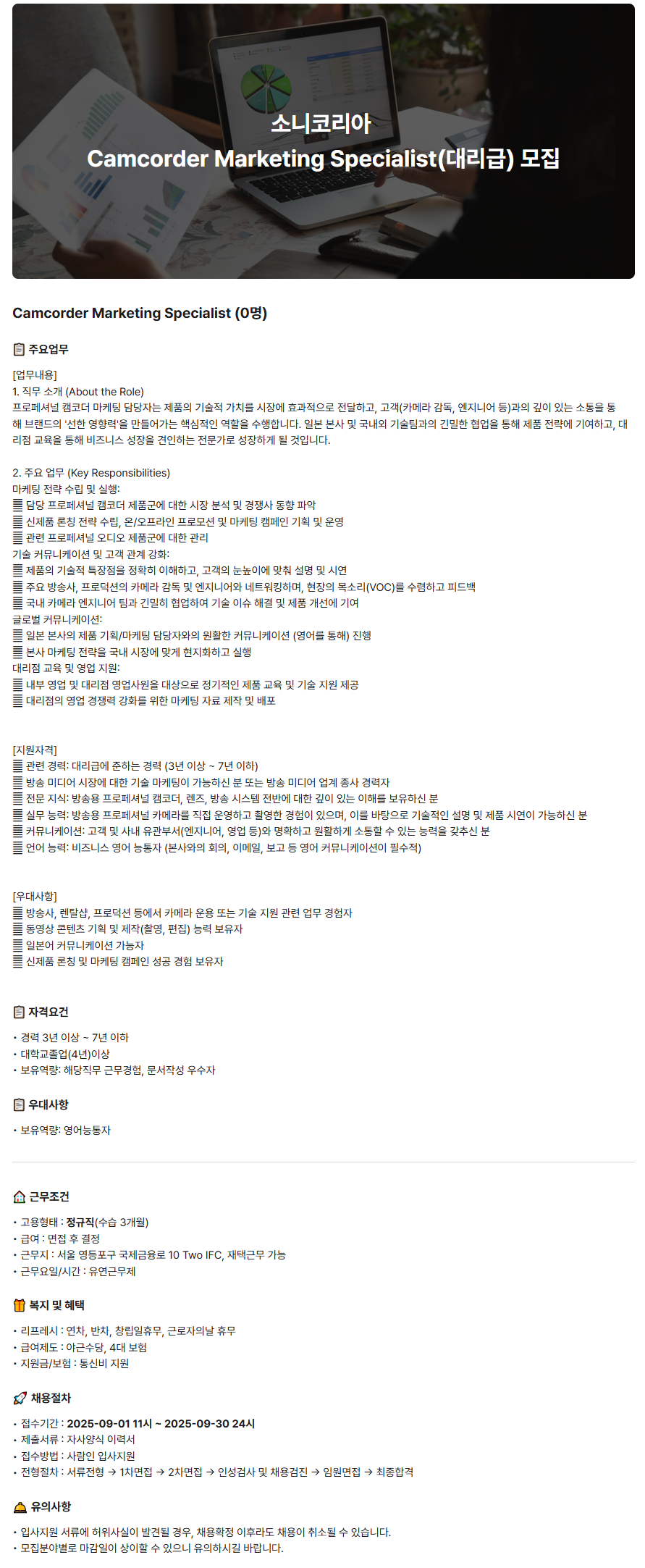 [소니코리아㈜] 소니코리아 Camcorder Marketing Specialist(대리급) 모집