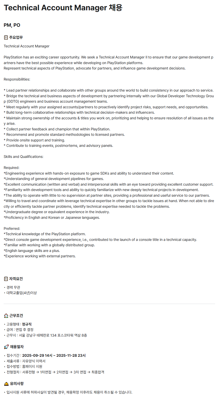 [(주)소니인터랙티브엔터테인먼트코리아]Technical Account Manager 채용