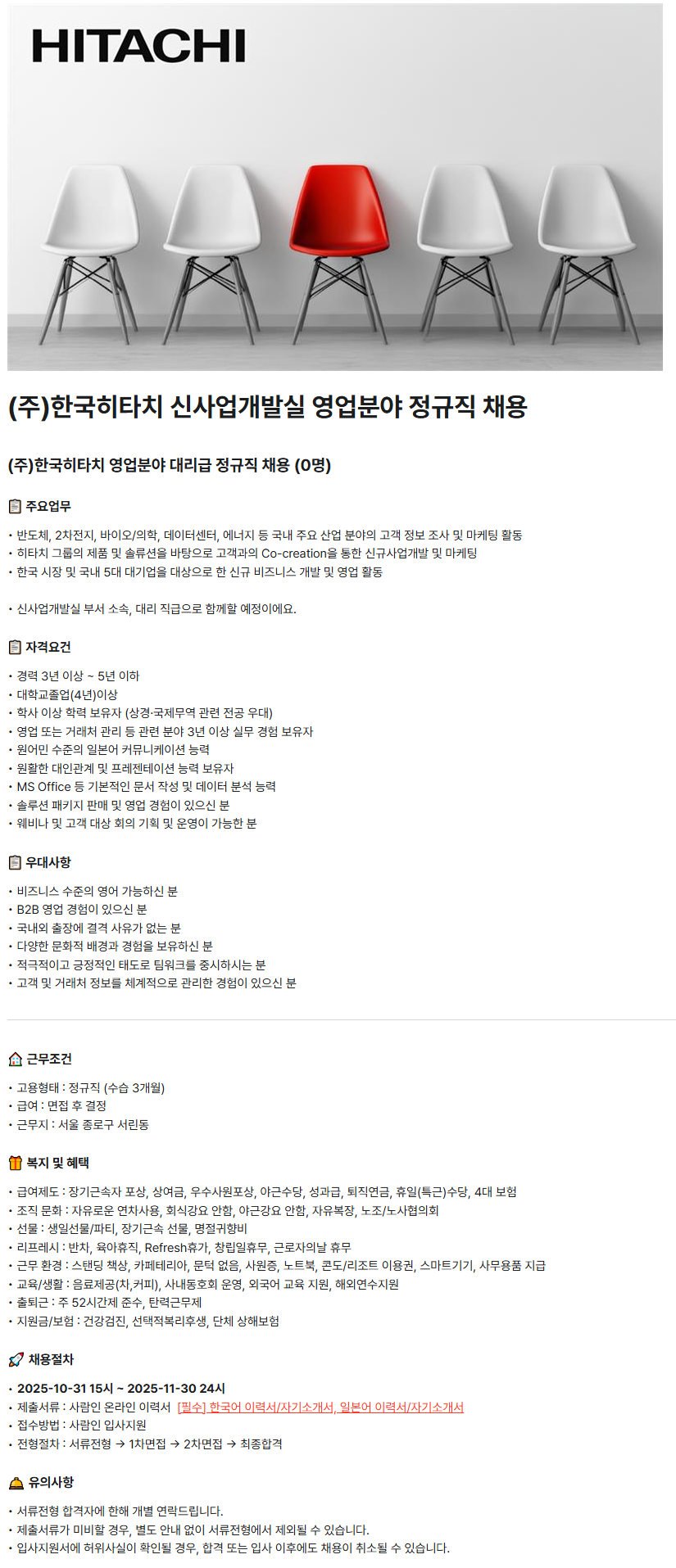 [(주)한국히타치] 신사업개발실 영업분야 대리급 정규직 채용