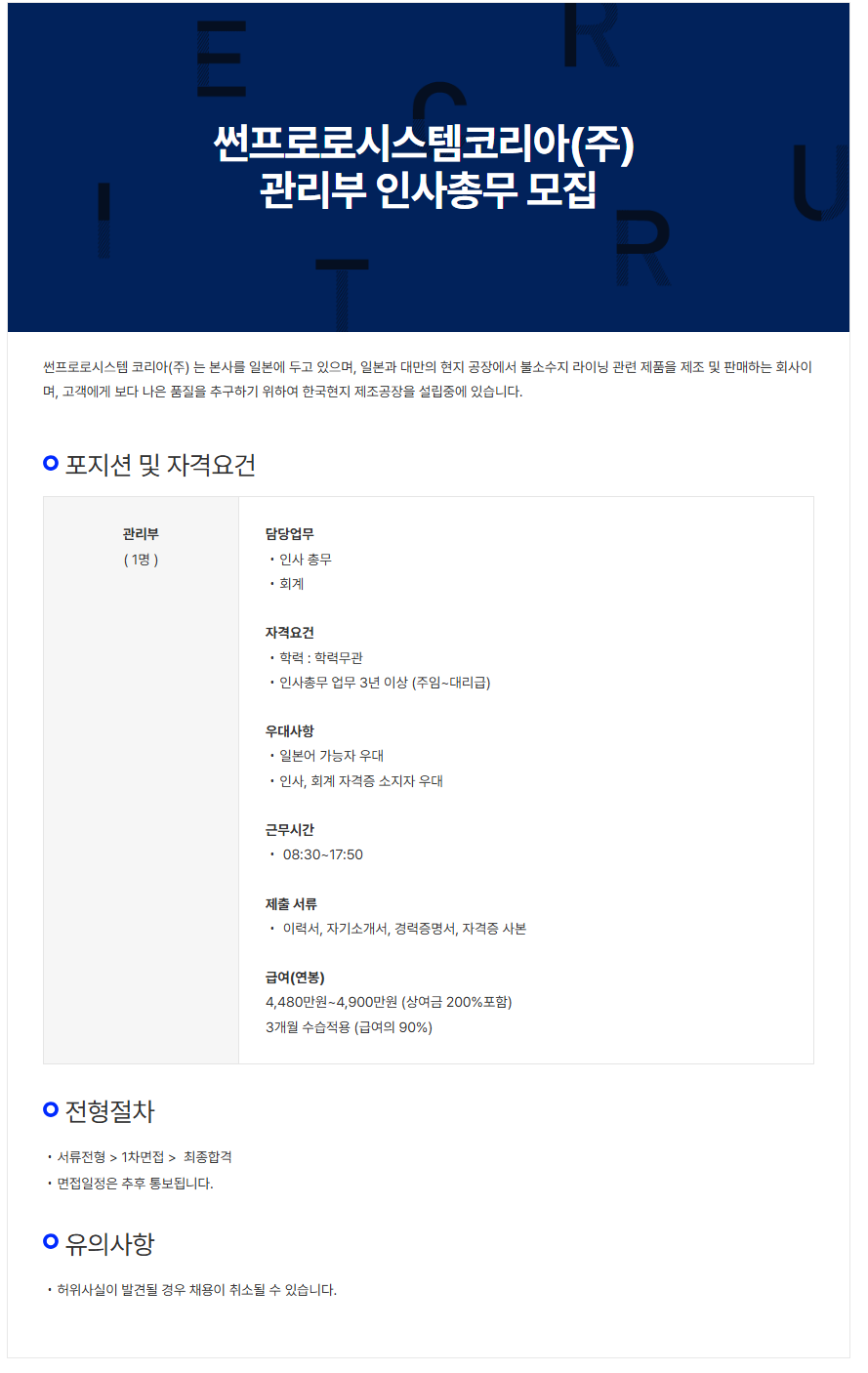 [썬프로로시스템 코리아] 관리부 인사총무 모집
