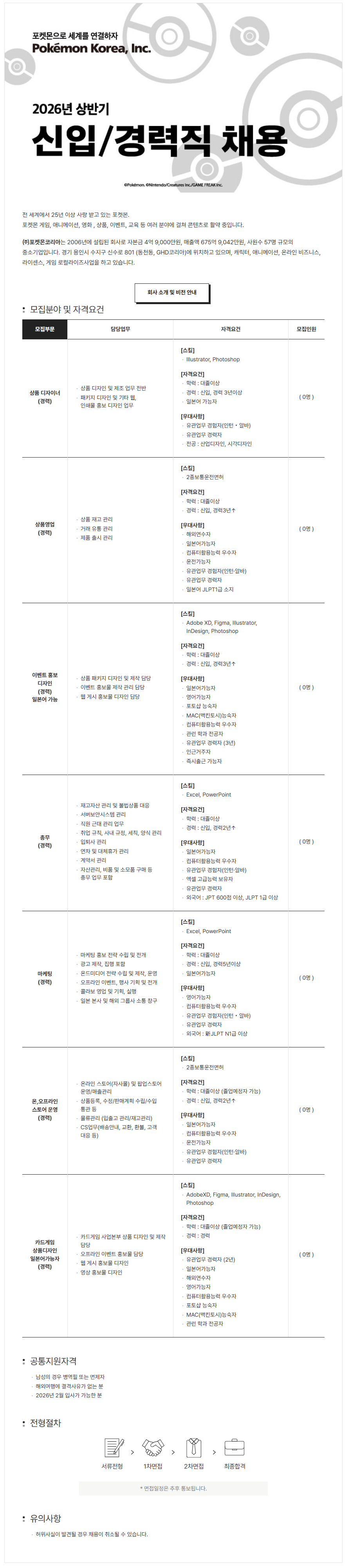 [㈜포켓몬코리아] 2026년 공개채용(상품 및 카드 디자이너,상품영업,총무,온오프라인 스토어 운영)